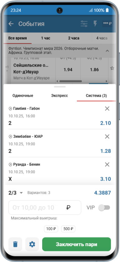 Игроку предлагается отметить от 2 до 16 событий из разных дисциплин, лиг или турниров. Все они автоматически добавятся в корзину, и программа сама рассчитает количество возможных комбинаций. При этом в купоне можно указать конкретный вариант: например, система «2 из 3», «3 из 5» и так далее. Это значит, что для выигрыша достаточно угадать не все исходы, а лишь определенное количество.