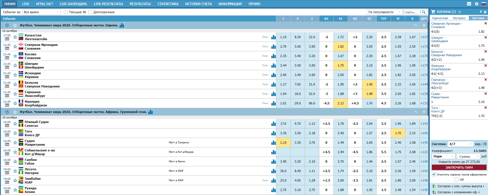 Оформление доступно где угодно — в мобильном приложении, в мобильной версии или на официальном сайте. Главное — внимательно проверять выбранные исходы, коэффициенты и число комбинаций перед тем, как нажать «заключить пари».