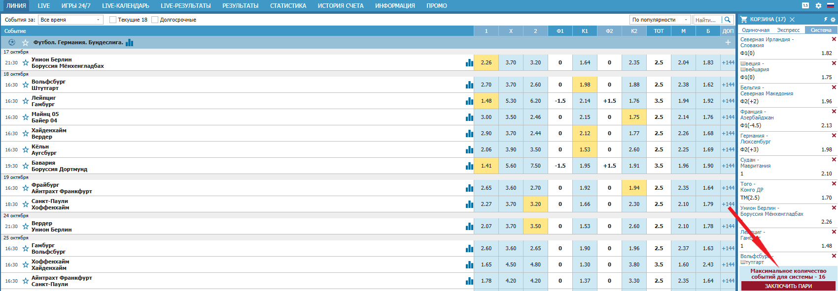 Минимум два события, максимум шестнадцать. Система делит внесенную сумму ставки между всеми комбинациями. Дополнительно действуют стандартные правила по коэффициентам и выбору исходов.