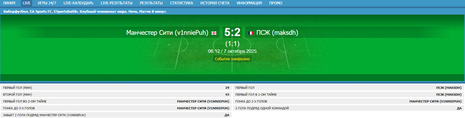 После этого остается только наблюдать за ходом матча — расчет происходит в течение нескольких секунд после окончания игры. Киберфутбольные матчи идут круглосуточно — ты можешь делать ставки в любое время суток.