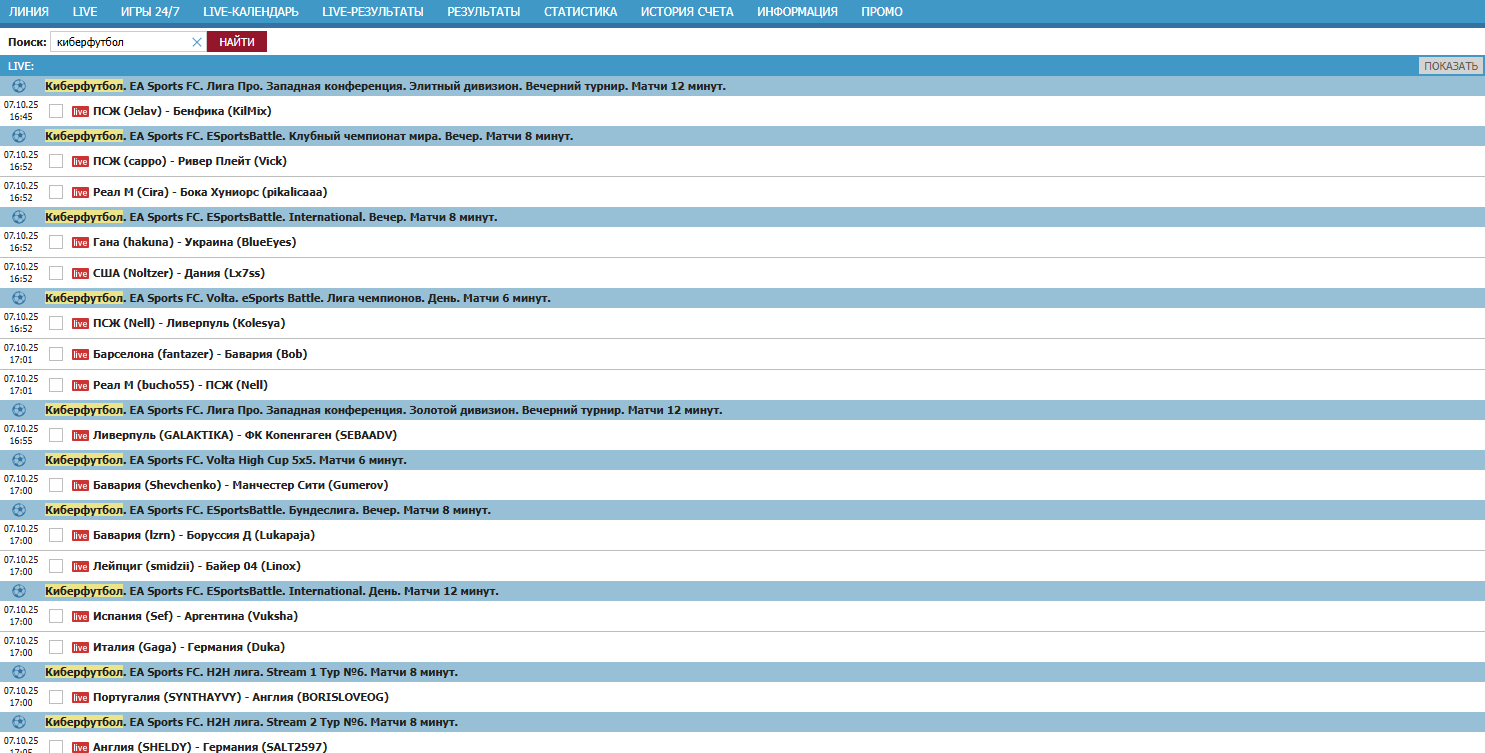 - Перейди в раздел «Киберфутбол» в линии ставок.