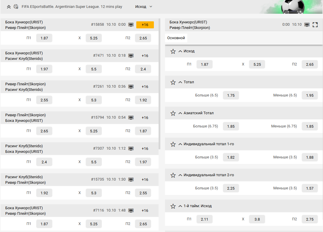 Melbet предлагает широкую роспись на киберфутбольные матчи как в прематче, так и в live-режиме. Можно выбирать простые или сложные рынки, комбинировать исходы и создавать экспрессы.