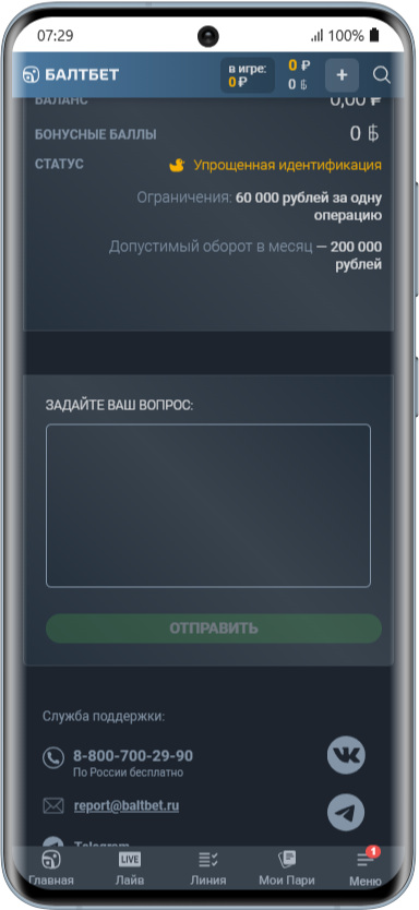 - Обратиться в службу поддержки. Узнайте о причинах блокировки вывода в саппорте. Связаться с техподдержкой можно через чат на сайте букмекера, по электронной почте report@baltbet.ru, в Telegram @hotline_baltbet_bot или по бесплатному телефону 8-800-700-29-90.