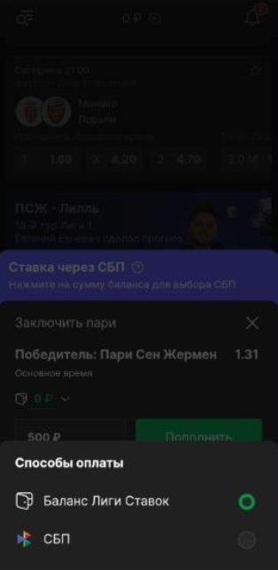 К сожалению, пари в один клик нет. Впрочем, их нет и в приложении — это один из основных минусов БК. Зато есть другая удобная функция, которая мне очень понравилась — ставка без депозита. Работает она так: вы выбираете опцию в билете, указываете номер телефона, и после подтверждения пари деньги списываются не с игрового счета, а напрямую с карты по СБП.