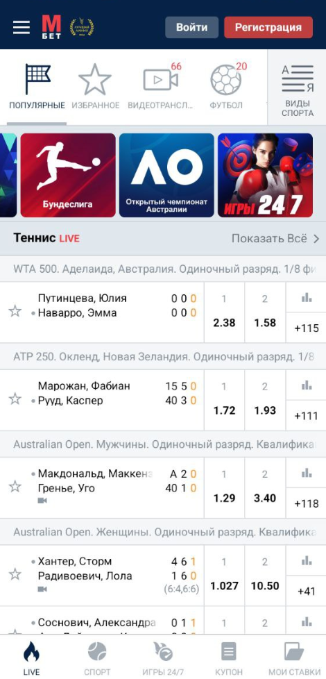 Регистрация и вход выполняются напрямую в приложении. После авторизации сохраняются все настройки, включая язык и формат отображения коэффициентов. Приложение корректно работает в фоне и не сбрасывает сессию при кратковременном сворачивании.