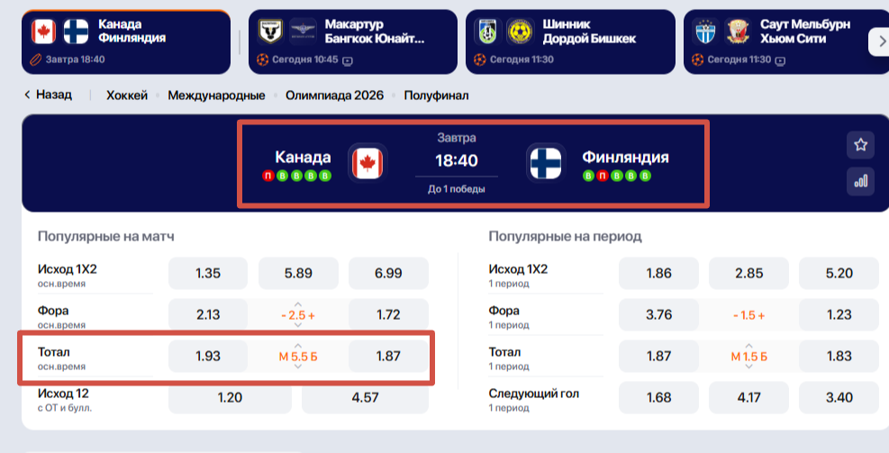По линии нашего постоянного партнера Винлайн победа Канады в основное время оценена в 1.35. Успех действующих олимпийских чемпионов — гигантские 6.99. Разница колоссальная, но не обманчивая: канадцы реально сильнее, просто финны умеют цепляться. Интереснее выглядит фора. На Канаду с -2.5 дают 2.13 — намек на то, что разгрома может и не случиться. Фора на Финляндию (+2.5) идет за 1.72, и это более жизненный вариант с учетом финского характера и проблем Канады с Чехией.