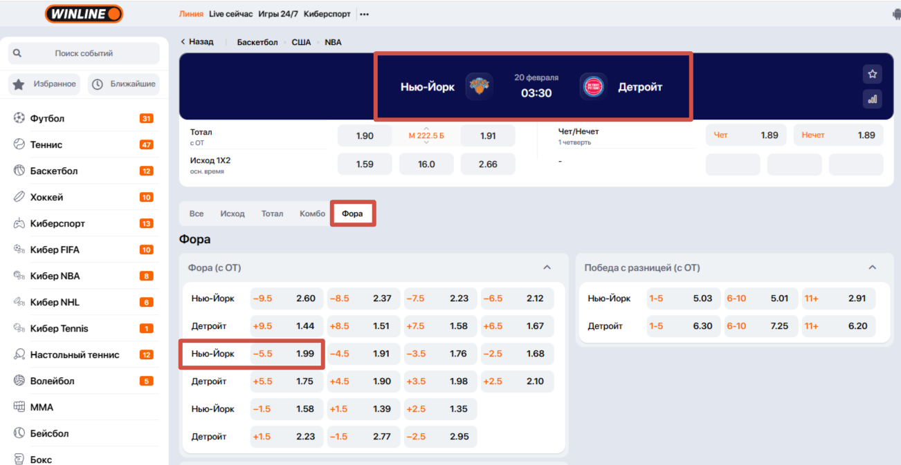 Хозяева паркета — в привычном статусе фаворита. По линии БК Винлайн победа «Никс» оценивается в 1.53, тогда как успех «Детройта» идет за 2.50. Рынок помнит две разгромные победы гостей в этом сезоне. С тоталами интереснее. Классическая линия на тотал больше 222.5 очка выставлена за 1.90, столько же дают и на «низ». Пробить планку в 113.5 очка хозяевам предлагают за 1.92, гостям для такого результата нужно прыгнуть выше головы. Наибольший интерес в росписи — ставки на результативность лидеров. Брансон и Каннингем обменяются дальними попаданиями? Трехочковые от разыгрывающих — отдельная история.