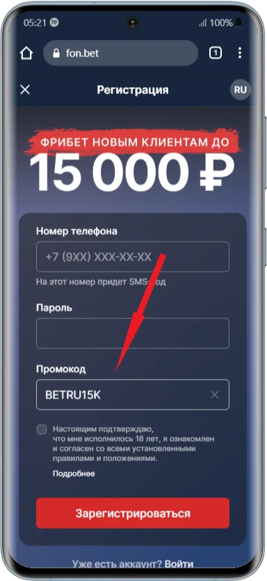 - Вставить в открывшееся поле промокод на фрибет BETRU15K и подтвердить действие.