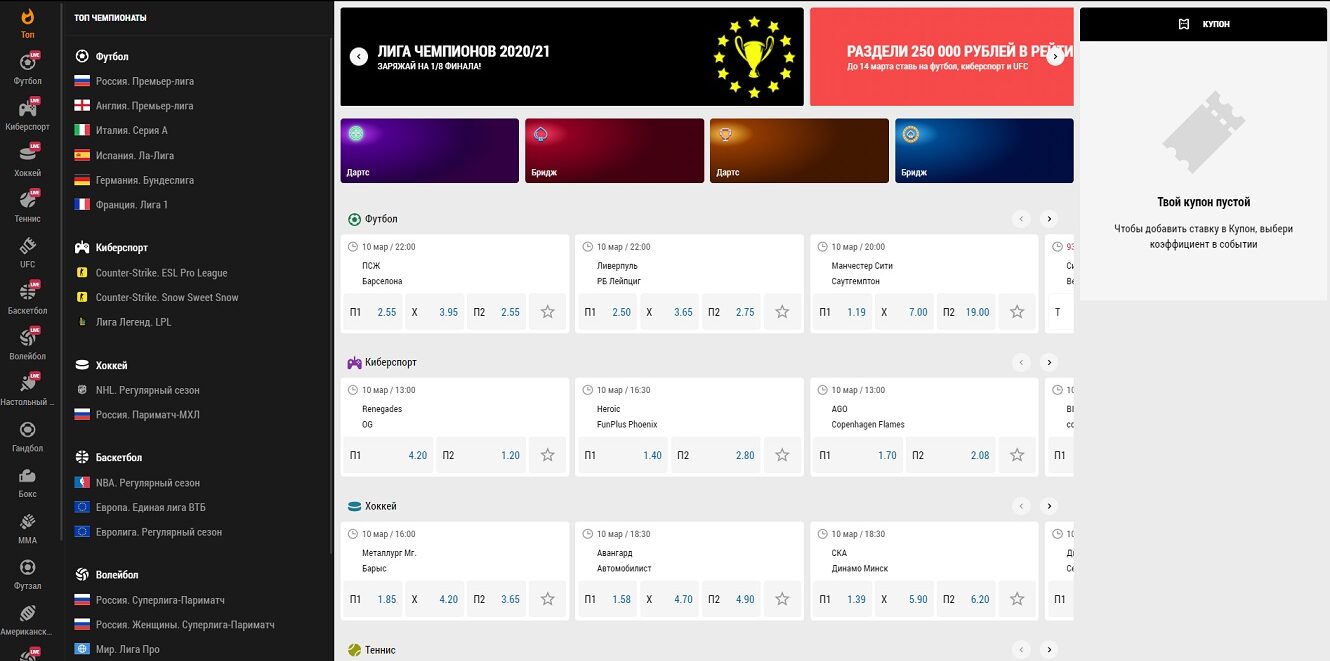 В правой части официального ресурса Париматч располагается специальный купон. Данная опция нужна для оформления пари.