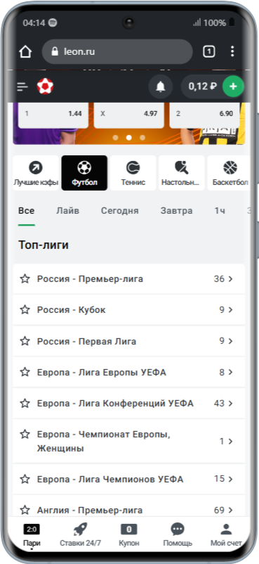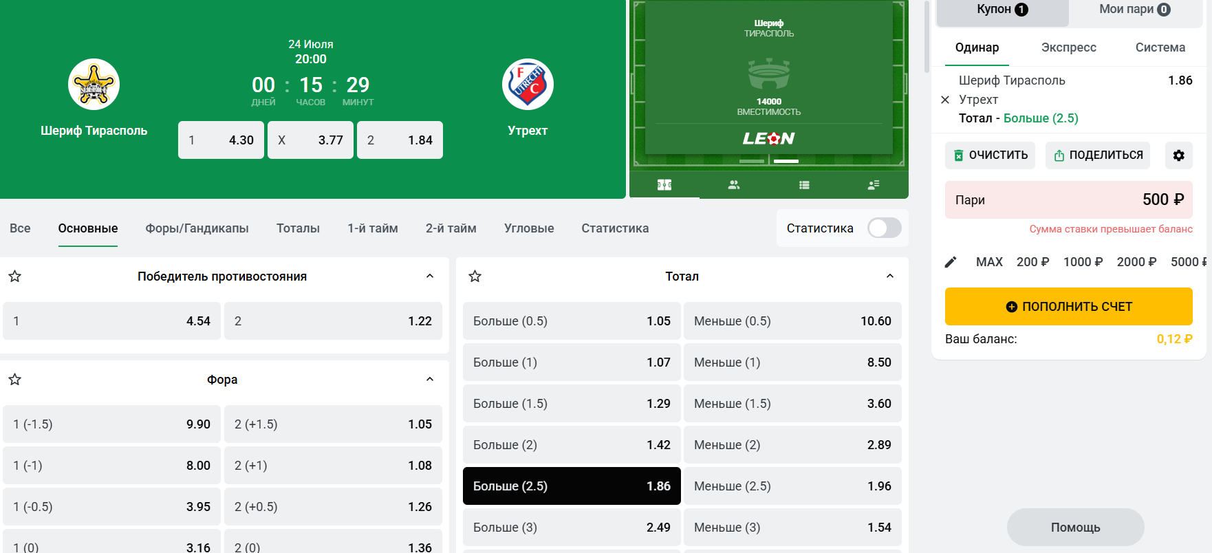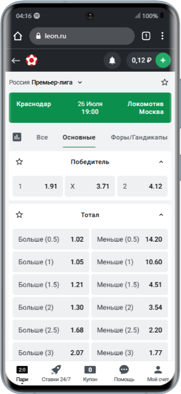 Чтобы заключить пари тотал в букмекерской компанииLeon, потребуется выполнить следующие действия: