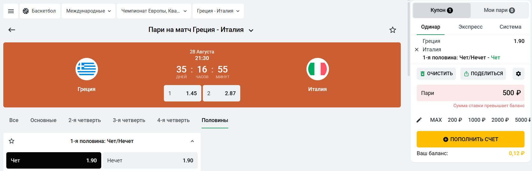 Ставка также доступна почти для всех дисциплин. Она предлагается по футболу, баскетболу, волейболу, теннису, гандболу и другим популярным видам спорта.