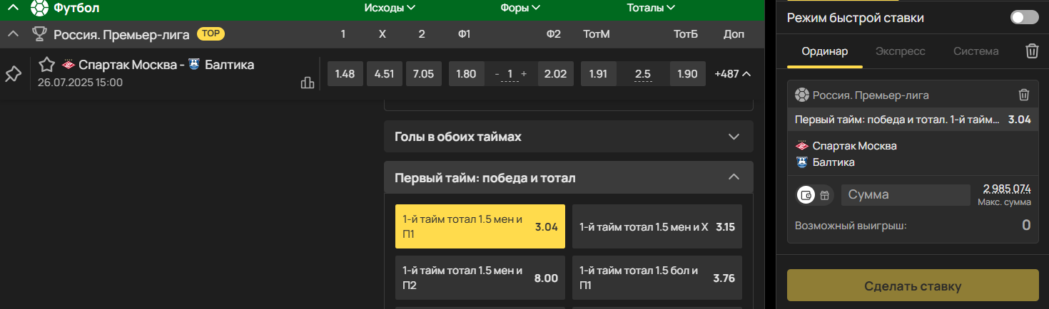 Для этого нужно выбрать любой исход, а затем еще и тотал — после этого билет Олимпбет автоматически переключиться в режим экспресса.