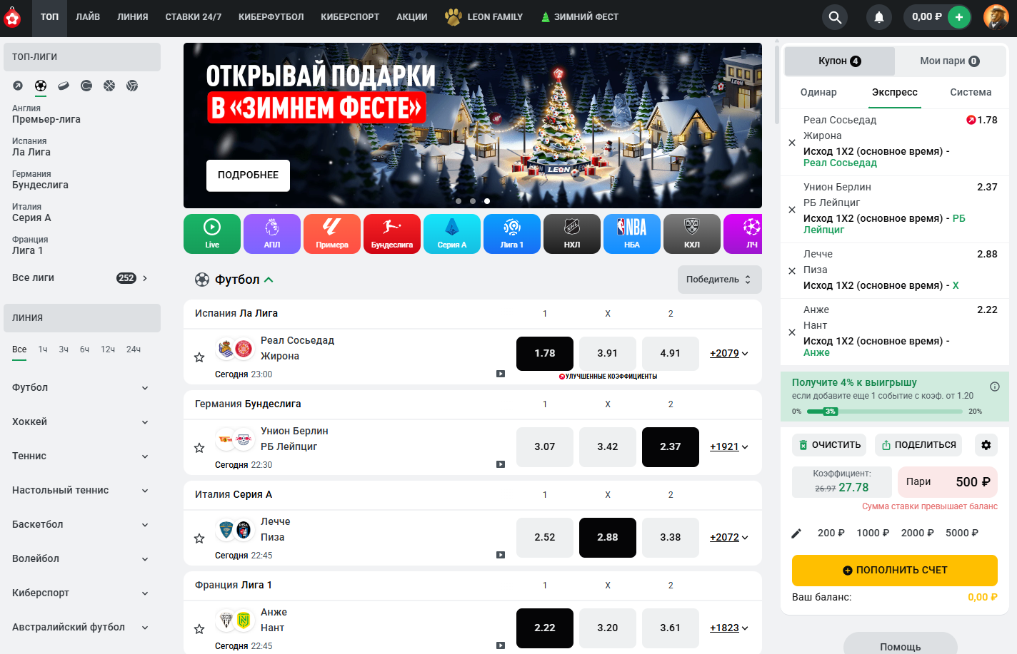Чтобы поставить экспресс в БК Леон на официальном сайте игроку требуется выполнить такие действия: