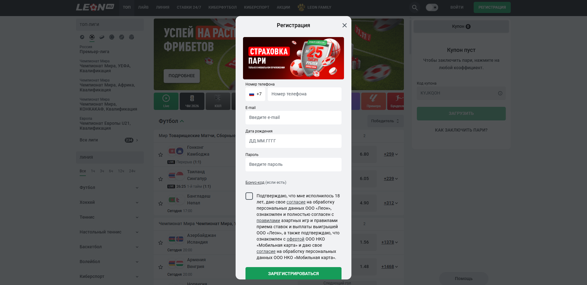 Чтобы зарегистрироваться в мобильной версии БК Леон, можно использовать смартфон или планшет. Для этого необходимо зайти на сайт с данного устройства, система автоматически его определит и откроет мобильную версию. Далее нужно сделать следующее:
