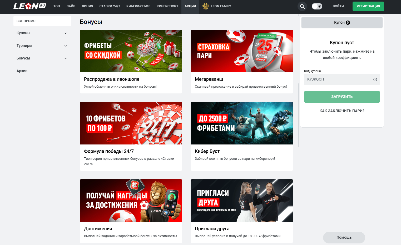 Как и большинство других букмекерских компаний, БК Леон дает бонусы при регистрации, привлекая новых клиентов . Каждый новый игрок имеет возможность получить фрибет до 25000 рублей за систематические ставки в конторе. Также новички могут получить приветственный фрибет на сумму 2000 рублей за установку мобильного приложения.